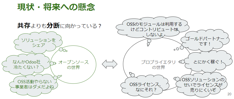 1) Odooはオープンソースであることの利点を活かして成功したプロダクトでありつつも、昨今は「オープンソースの世界」と「プロプライエタリの世界」のバランスが崩れてきている(「共存」から「分断」に向かっている)