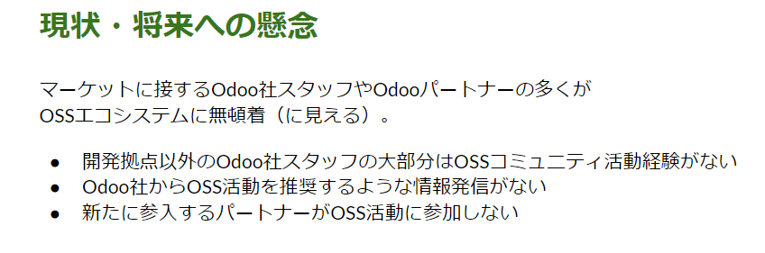 本来であれば、Odoo社からエコシステム全体を俯瞰してOSS活動の側面含めナーチャーする動きをとるなり情報発信するなりの動きがあるとよいのだとは思います。特に日本ではOSS活動が根付く前にプロプライエタリ側が拡大し始めたこともあり、マーケットに出る情報のバランスが崩れがちです。