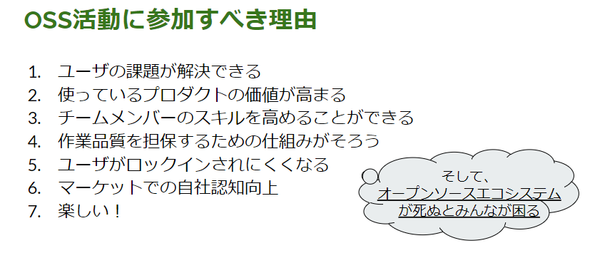 ですので、コタエルとしてはあえて、この崩れがちなバランスを持ち直す方向で発信すべき、という立ち位置をとっています。今回のイベントを皮切りに、OSS活動への参加に興味があるプレイヤーを具体的にサポートする動きをとっていくつもりです。また、ユーザ向けにも啓蒙活動というと偉そうですが、オープンソースの本質である「情報がオープンに流通する仕組み」から派生するメリットを、引き続き自らの行動を通じてお伝えしていければと思います。