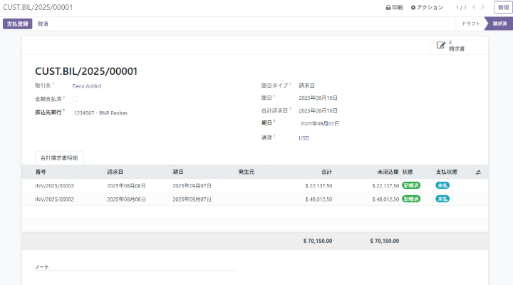 ですが、Odoo本体のみではこの要求には十分に対応していません。Odoo標準機能では、複数オーダの一括請求は可能ですが、日本特有の月中締め(20日締など)が絡むと会計期間との整合が崩れてしまうところに課題があります。