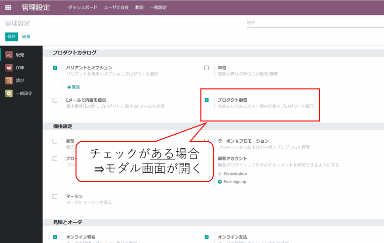 Odoo13.0では、「プロダクト梱包」の設定は販売オーダ明細の挙動には影響しないもよう(詳細未確認)。