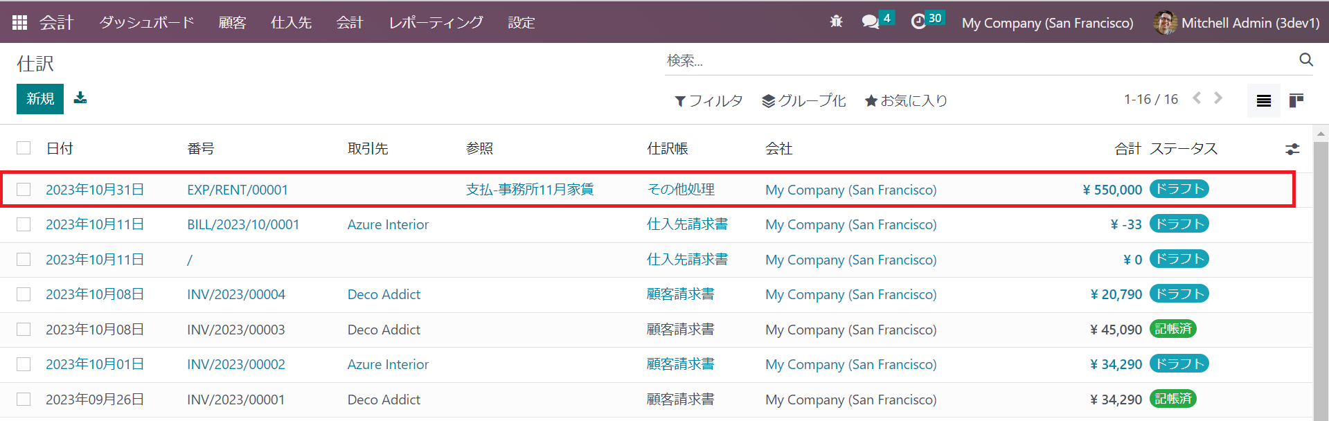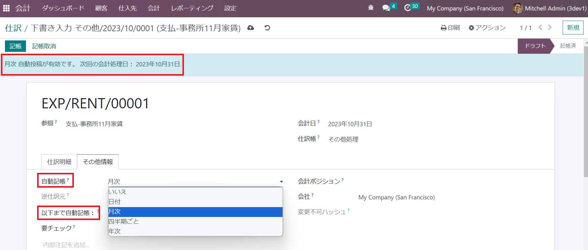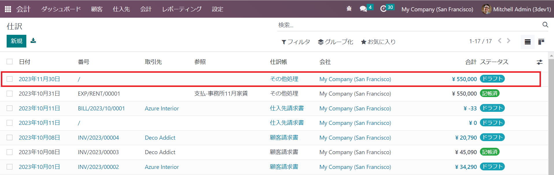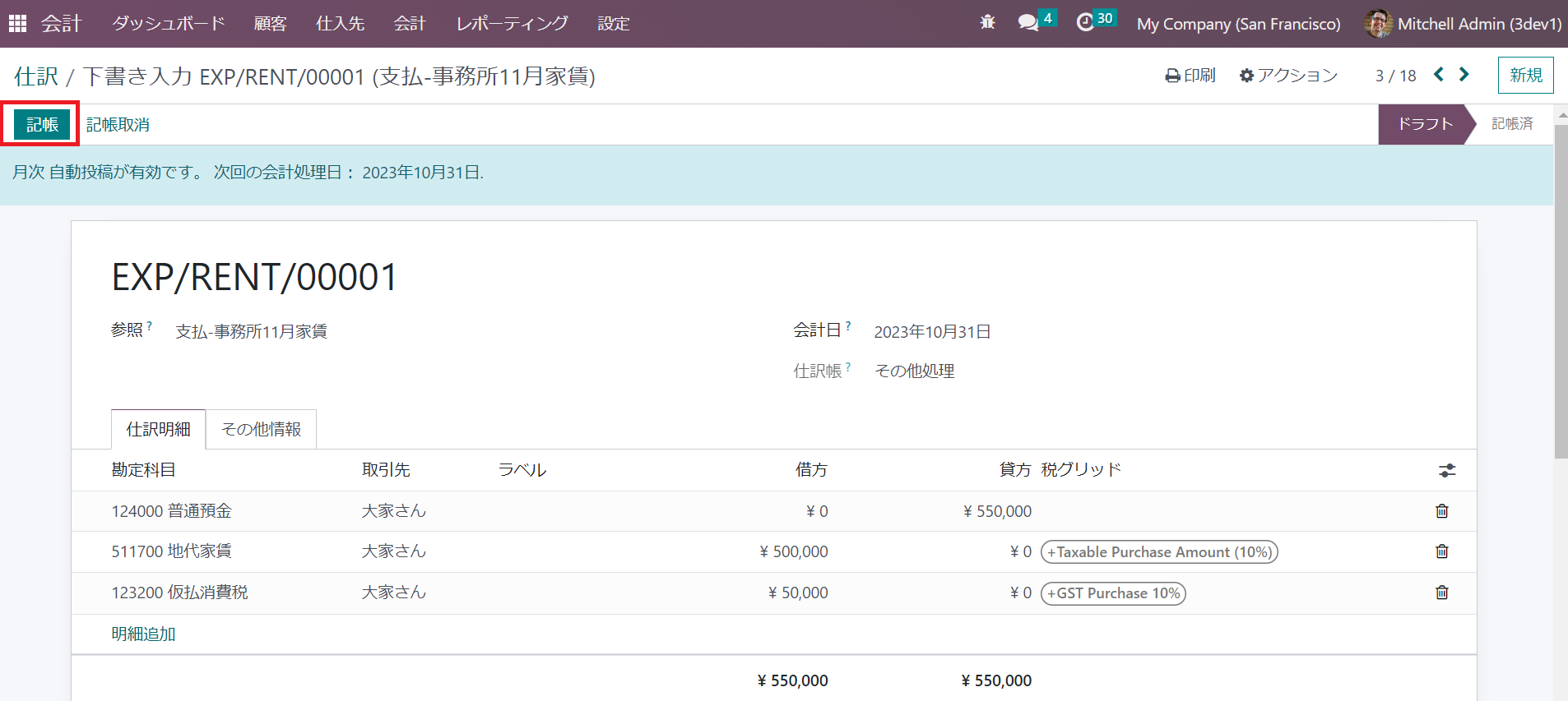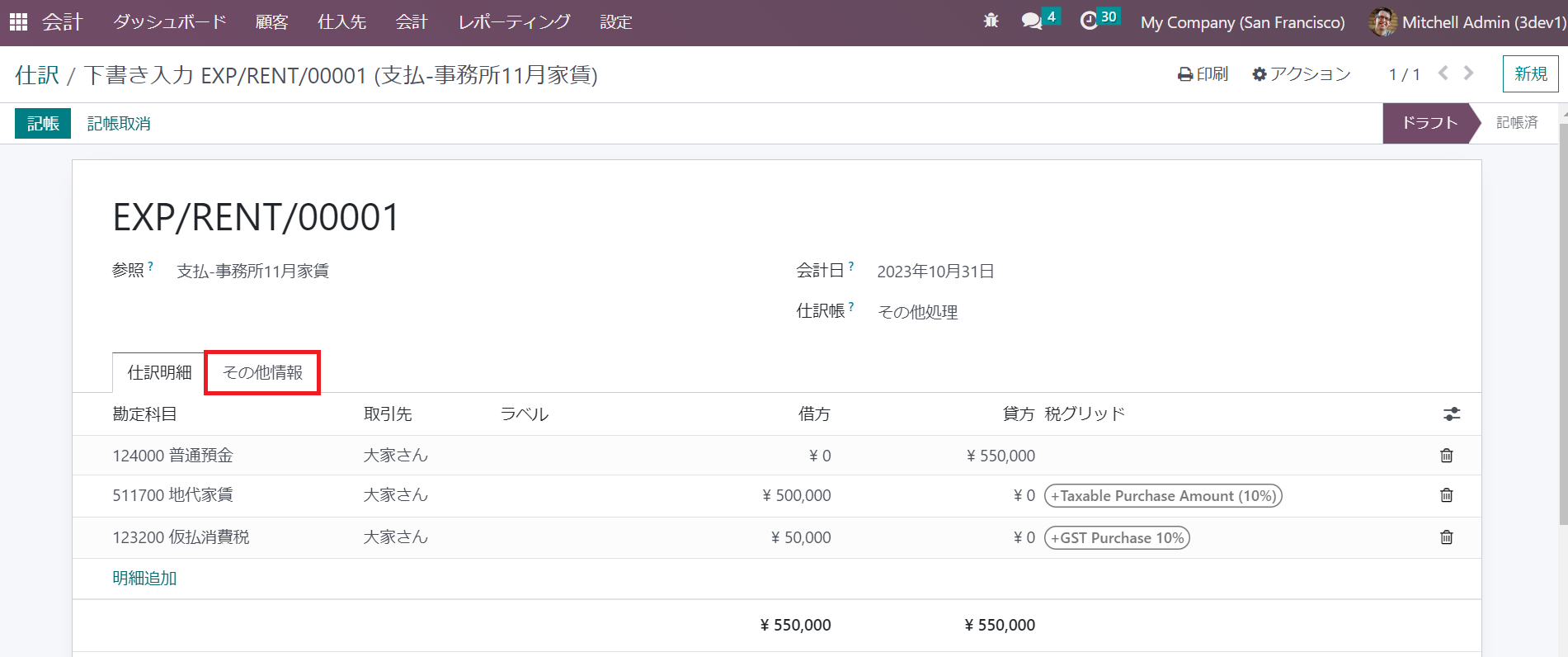 ③ 保存後、11月分家賃のドラフト仕訳レコードが画面の最上部に表示されます。