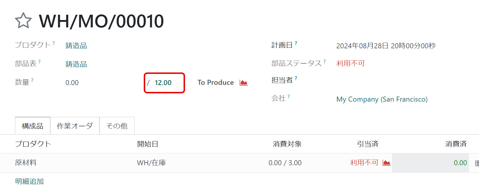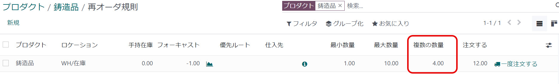 例えば4個込で鋳造する製品につき10個の受注があったときに、製造オーダは10個ではなく12個で作成する必要がある。Odooでどう対応できるか。
